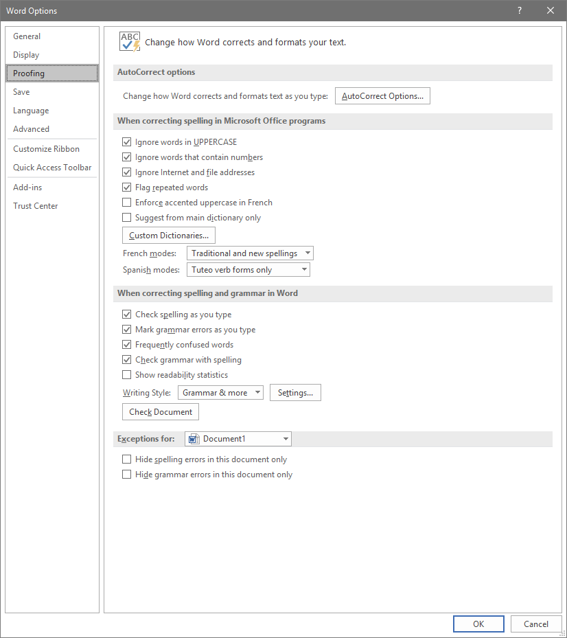 To access these rules, select File, and from there, Options. A new window should pop up with a Proofing option in the list. That page looks like this: