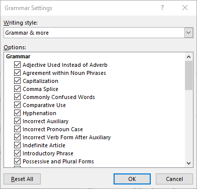 These are the controls for the grammar rules that Word works under. It’s comprehensive, but if you toggle some off, you will be flagged for less mistakes, causing fewer distractions.